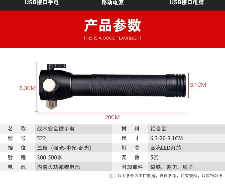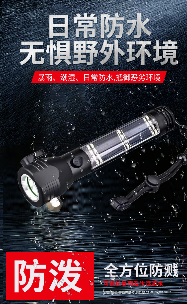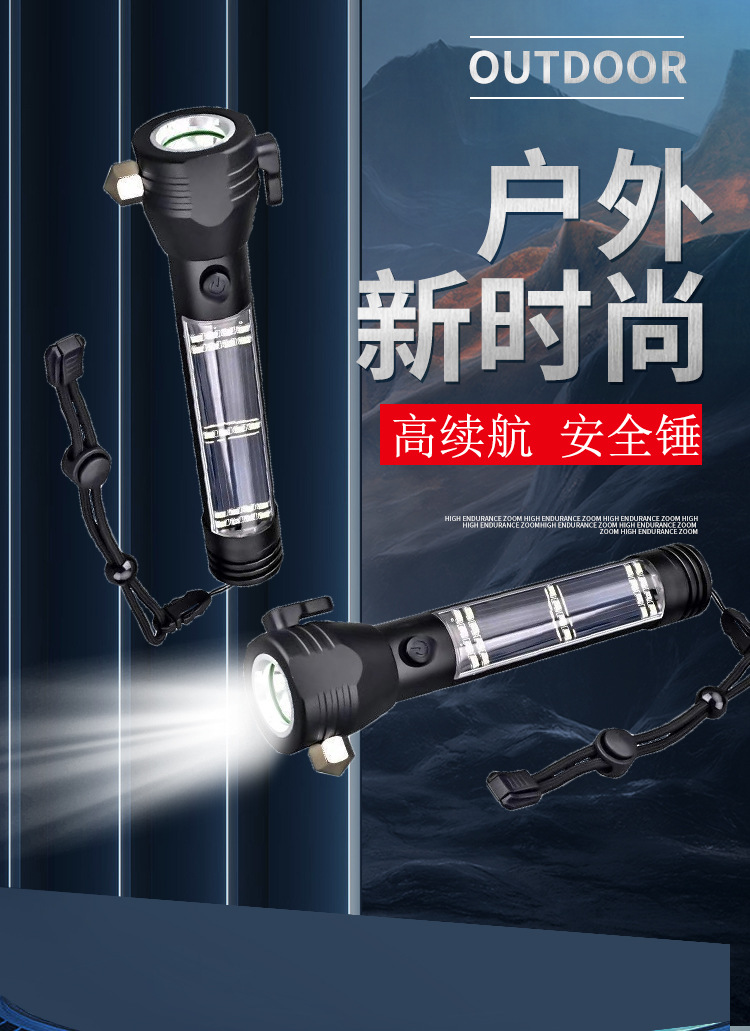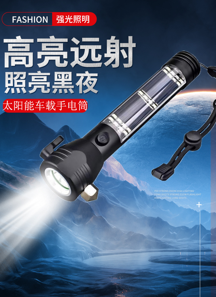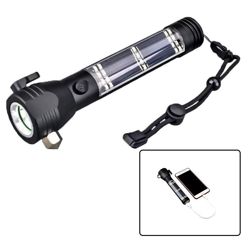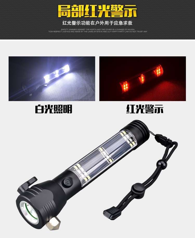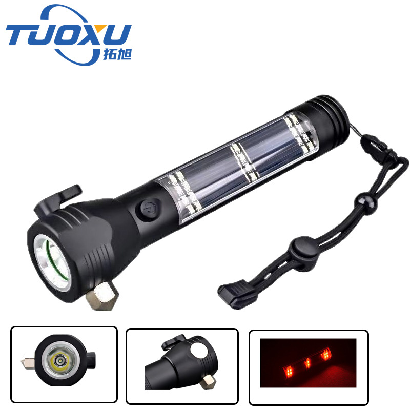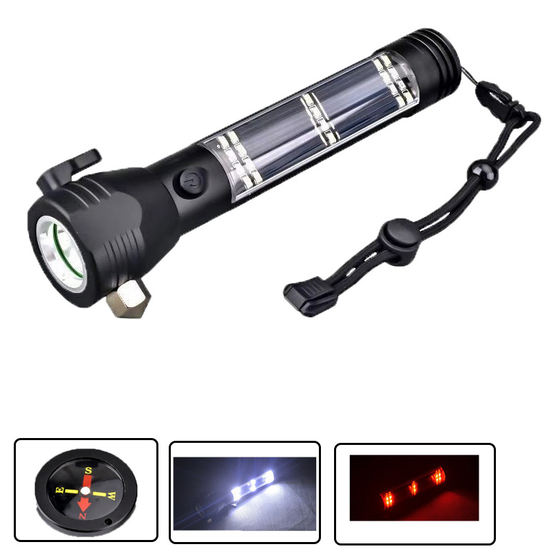 Solar-Powered Charging High-Intensity Car Flashlight, Usb Waterproof Outdoor Aluminum Alloy Led Emergency Light, Red Warning Light